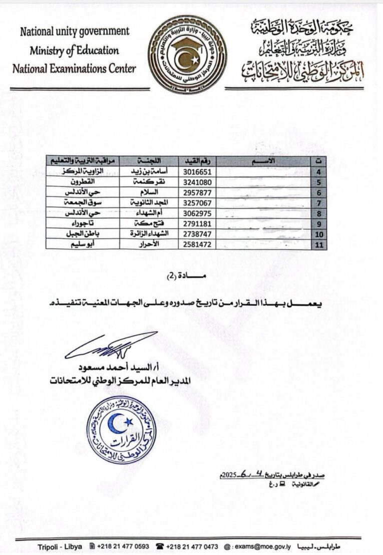 وأشار القرار إلى أن التلاميذ المعنيين ينتمون إلى عدد من مراقبات التربية والتعليم بمختلف المدن الليبية، من بينها: بنغازي، العجيلات، الزاوية، القطرون، حي الأندلس، سوق الجمعة، أبو سليم، تاجوراء، وباطن الجبل.