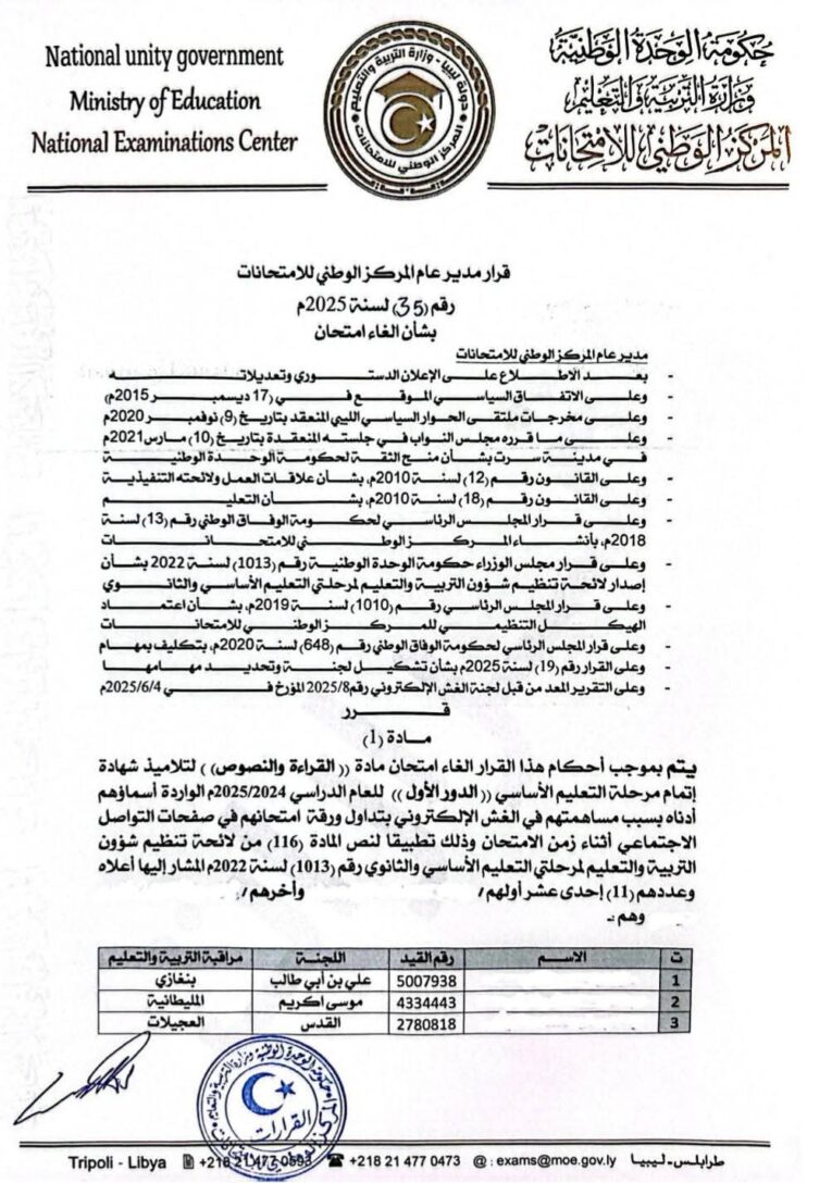 أصدر المدير العام للمركز الوطني للامتحانات أحمد مسعود، القرار رقم (35) لسنة 2025، بإلغاء امتحان مادة “القراءة والنصوص” لـعدد 11 تلميذًا من طلبة شهادة إتمام مرحلة التعليم الأساسي (الدور الأول) للعام الدراسي 2024-2025، وذلك بسبب مشاركتهم في الغش الإلكتروني عبر تداول ورقة الامتحان على وسائل التواصل الاجتماعي أثناء زمن الامتحان.
