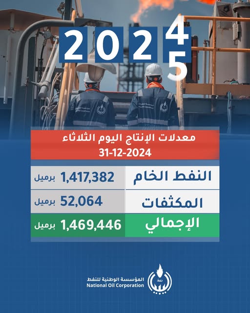 نشرت المؤسسة الوطنية للنفط العام 2024، بيانا تحدثت فيه “عما حققته من نجاحات في تحدٍ صعب للظروف الاستثنائية التي تمر بها البلاد، وعلى رأسها ما تم تحقيقه على مستوى زيادة الإنتاج، الذي تجاوز المعدل المعلن عنه في خطتها لهذا العام”.