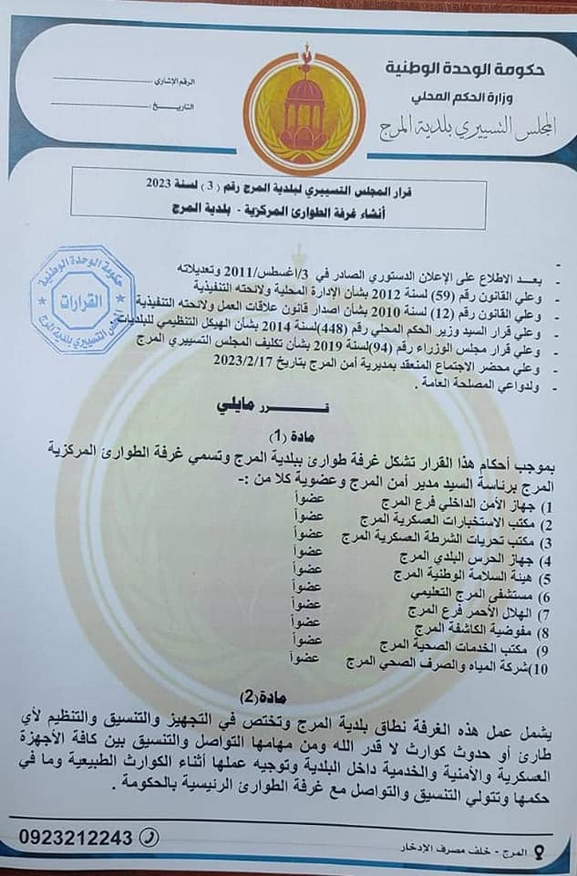 أصدر عميد بلدية المرج وليد صلهوب، القرار رقم (3)لسنة 2023م، بشأن تشكيل غرفة طوارئ ببلدية المرج وتسمى غرفة الطوارئ المركزية المرج برئاسة مدير أمن المرج العميد وهبي الرخ، وذلك بعد تسجيل هزات أرضية في المدينة خلال الأيام الماضية.