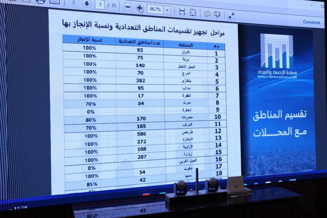 وقدم الفريق الفني بالمصلحة، عرضاً ضوئياً يوضح المراحل المنفذة من المشروع ونسب الإنجاز الفنية ابتداء من تقسيم ليبيا وفق المناطق التعدادية تأسيسا للمعايير الدولية، واستكمال المسح الاقتصادي للمؤسسات العاملة في النشاط الخدمي والتجاري والصناعي، إلى جانب البدء الفعلي بالمرحلة الأولى من المشروع الذي يشمل حصر الأسر والمباني والمساكن والمنشآت وفق كل بلدية، الذي لم يُنجَز منذ عام 2006، مؤكدا إكمال المصلحة كل التحضيرات الفنية والإدارية لإنجازه وفق الجدول الزمني المعتمد.