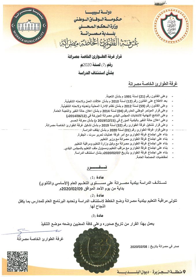 أصدرت غرفة الطوارئ الخاصة مصراتة، قرارها باستئناف الدراسة لمرحلتي التعليم الاساسي والثانوي اعتبارا من يوم غد الأحد.