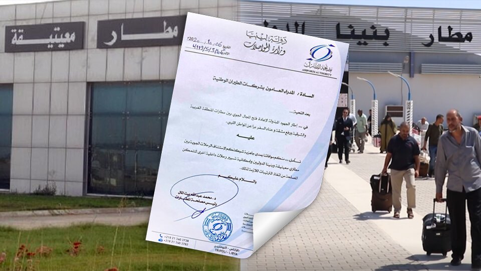 طالبت مصلحة المطارات التابعة لوزارة المواصلات بحكومة الوفاق، شركات الطيران الوطنية بتوضيح مدى جاهزيتها لاستئناف الرحلات الجوية بين مطاري معيتيقة الدولي وبنينا الدولي.