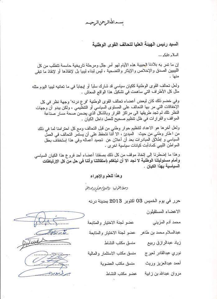 تقدم ستة أعضاء من فرع حزب تحالف القوى الوطنية في درنة باستقالة جماعية من الحزب، مشيرين خلال بيان لهم أن أسباب الاستقالة اسخفاف قيادة الحزب بعقلية المواطن الليبي-حسب وصفهم، بالاضافة إلى بعض الممارسات التي لا يستشار فيها أحد وىخرها إطلاق مبادرة حوار وطني رغم أن الحزب جمد أعماله، وأشار الأعضاء إلى أن التحالف شريك فيما تشهده ليبيا الان سواء سلبا أوإيجابا.