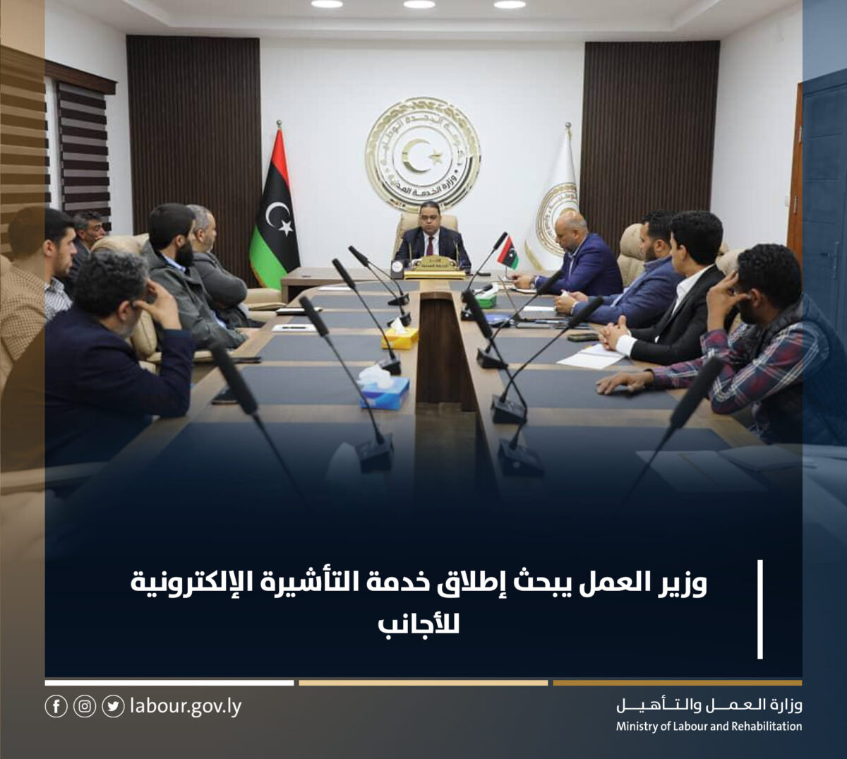 ناقش وزير العمل والتأهيل في حكومة الوحدة الوطنية علي العابد، مع جهاز المخابرات العامة، ومصلحة الجوازات والجنسية، والشركة القابضة للاتصالات، خطوات استكمال الإجراءات القانونية المتعلقة بتأشيرة العمل الإلكترونية للأجانب، تمهيداً لإطلاقها الفترة المقبلة.