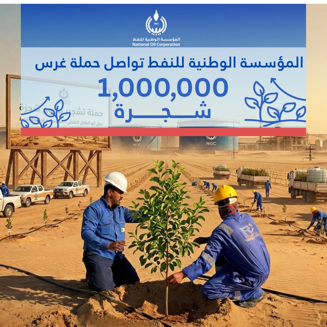 تواصل المؤسسة الوطنية للنفط حملة التشجير التي أطلقتها مؤخرًا، والتي تهدف إلى غرس مليون شجرة في مختلف مناطق ليبيا، ضمن استراتيجيتها الرامية إلى الحد من انبعاثات ثاني أكسيد الكربون وتعزيز البيئة المستدامة.
