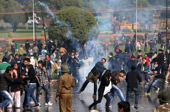 استخدمت الشرطة الهندية الهراوات والغاز المسيل للدموع وخراطيم المياه للتصدي لآلاف الأشخاص الذين نظموا مسيرة إلى قصر الرئاسة أمس السبت (22 يسمبر/ كانون الأول 2012) في احتجاجات تزداد شدتها في الشوارع ووسائل التواصل الاجتماعي للتنديد بمجموعة من الأشخاص اغتصبوا امرأة. وتخوض الضحية التي تبلغ 23 عاماً معركة من أجل البقاء على قيد الحياة في مستشفى بعد تعرضها للضرب والاغتصاب لمدة ساعة تقريباً ثم ألقي بها من حافلة متحركة في شارع نيودلهي المزدحم يوم الأحد الماضي. وألقي القبض على خمسة أشخاص. ويطالب المحتجون وغالبيتهم من طلبة الجامعة بتوقيع عقوبة الإعدام على المتهمين وتقديم ضمانات بشأن سلامة النساء.