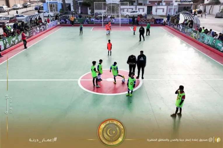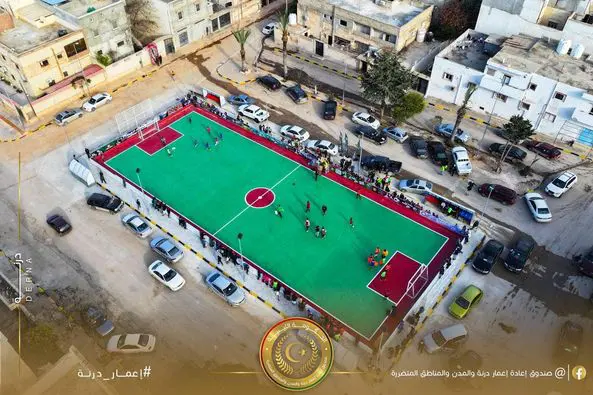 افتتح في مدينة درنة مساء أمس الجمعة، ملعب الزهور بحي باب طبرق، الذي أنشأه صندوق إعادة إعمار درنة والمدن والمناطق المتضررة، وذلك بحضور عدد من الشخصيات الرسمية والوجهاء وأهالي المدينة.