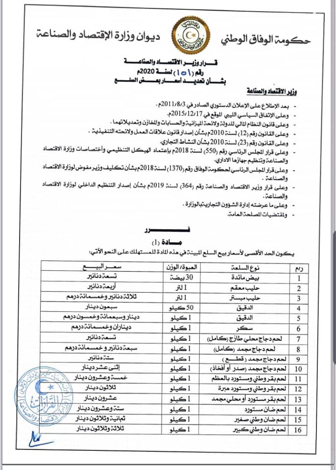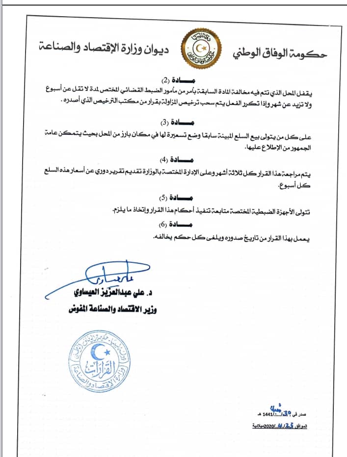 وانطلاقا من ذلك وحفاظا على استقرار السوق وتوفر السلع خاصة مع قدوم شهر رمضان المبارك الذي يكثر فيه الطلب على سلع محددة بالذات فقد أصدر اليوم وزير الاقتصاد والصناعة قراره رقم 101 لسنة 2020، وفقاً لمكتب الإعلام بالوزارة.