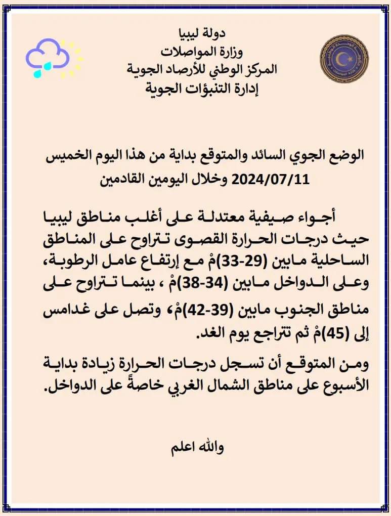 أفاد المركز الوطني للأرصاد الجوية، بوجود أجواء صيفية معتدلة على أغلب مناطق ليبيا حيث تتراوح درجات الحرارة ما بين (29-33)، مع ارتفاع عامل الرطوبة.