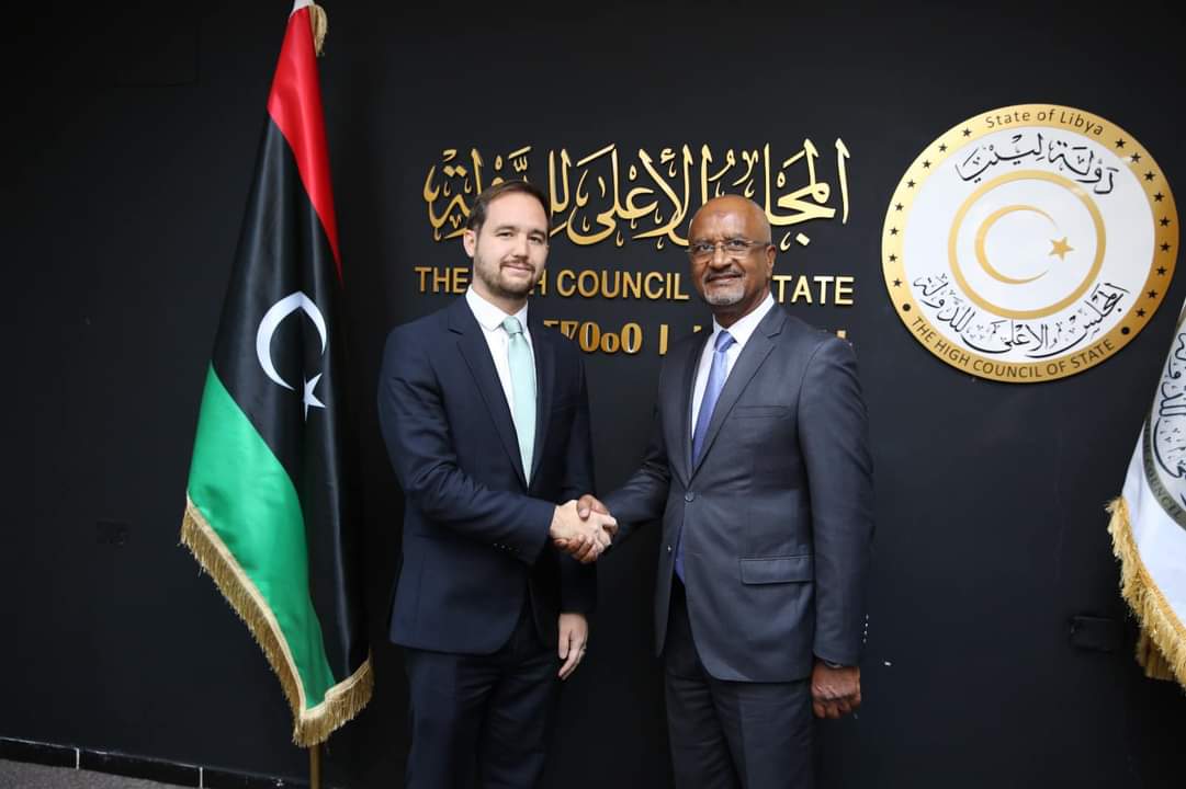 عقد رئيس لجنة الشؤون السياسية بالمجلس الأعلى للدولة الدكتور عبد العزيز حريية برفقة عضو اللجنة الدكتور أحمد همومة، اليوم الأحد، لقاء مع رئيس المكتب السياسي في سفارة الولايات المتحدة الأمريكية، ماتيو نوربكي.