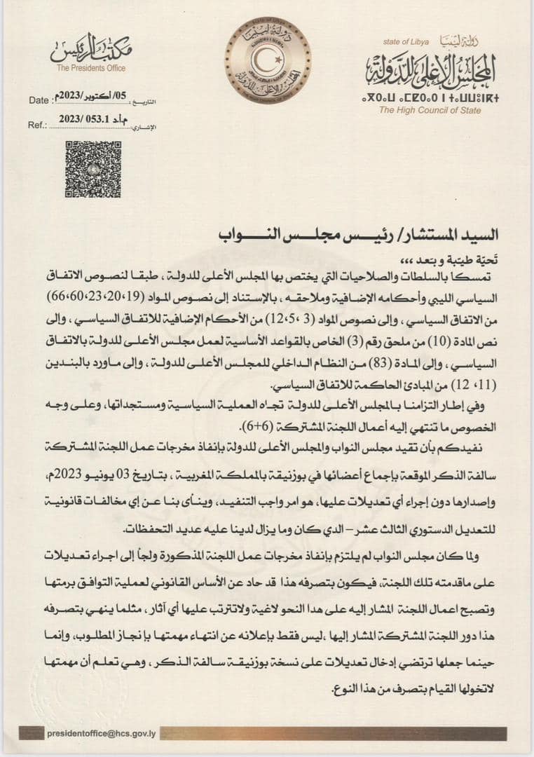 وفي سياقٍ ذي صلة، خاطب رئيس المجلس الأعلى للدولة محمد تكالة، رئيس مجلس المفوضية الوطنية العليا للانتخابات عماد السائح، بكتاب رسمي تضمن تأكيدًا على ضرورة التقيد بالتعديل الدستوري الثالث عشر، والامتناع عن تنفيذ أي تشريعات مخالفة لنسخة القوانين الانتخابية الأولى الموقعة في بوزنيقة، بما يكفل للمفوضية النأي عن أية تجاذبات سياسية، واستمرارها في الحفاظ على دورها الشفاف والمحايد، ويضمن تحريها الدقة في تطبيق تشريعات انتخابية غير معيبة تؤدي إلى الاستقرار المنشود، بحسب الخطاب.
