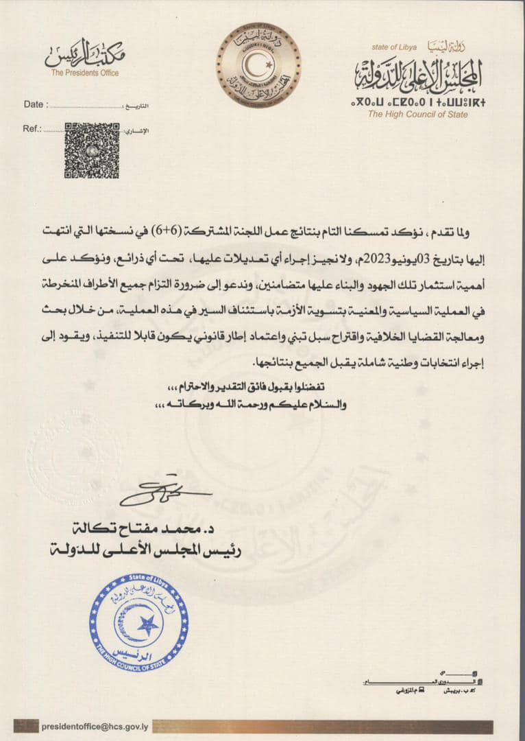 أكد رئيس المجلس الأعلى للدولة محمد تكالة، تمسك المجلس بنتائج أعمال لجنة 6+6 الموقعة في بوزنيقة المغربية بتاريخ 3 يونيو 2023م، وعدم قبول أي تعديل على هذه النتائج تحت أية ذرائع.