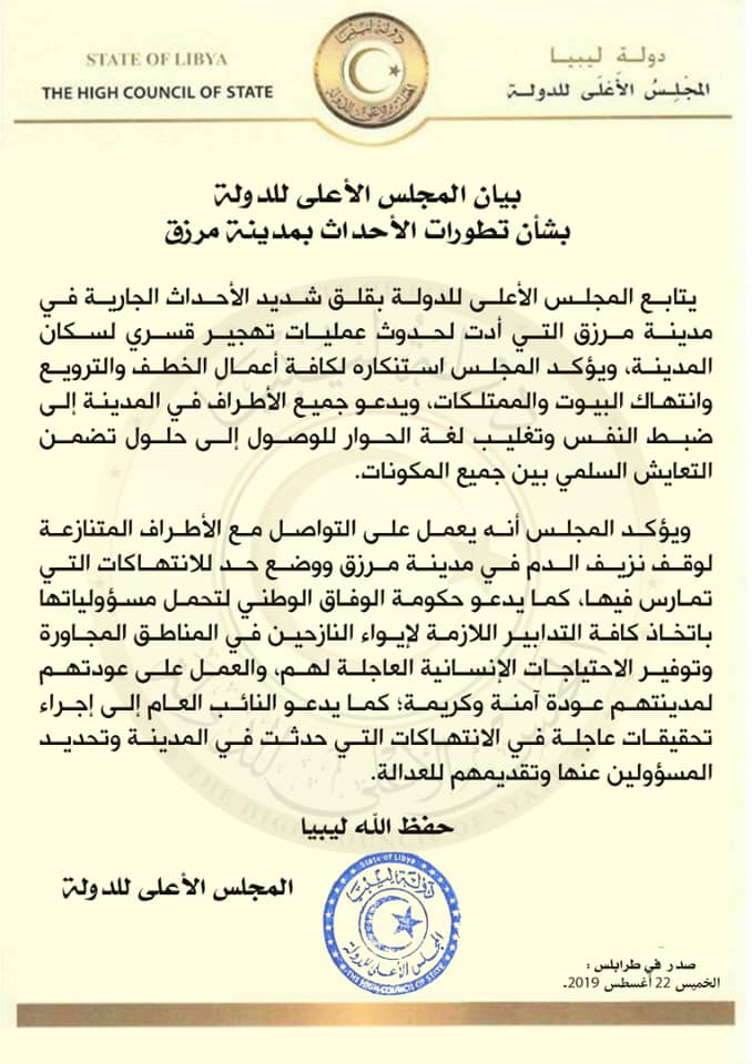 يأتي ذلك في حين قال المجلس الأعلى للدولة، إنه يتابع بقلق شديد الأحداث الجارية في مدينة مرزق التي أدت لحدوث عمليات تهجير قسري لسكان المدينة.