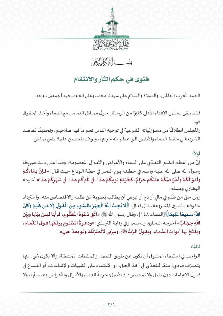 أصدر مجلس الإفتاء الأعلى في سوريا فتوى تحذر من ممارسة الثأر والانتقام خارج نطاق القضاء والقانون، مؤكداً خطورة ظاهرة الثأر الفردي وأهمية التحاكم إلى القضاء الشرعي لضمان حفظ الحقوق ومنع الظلم.