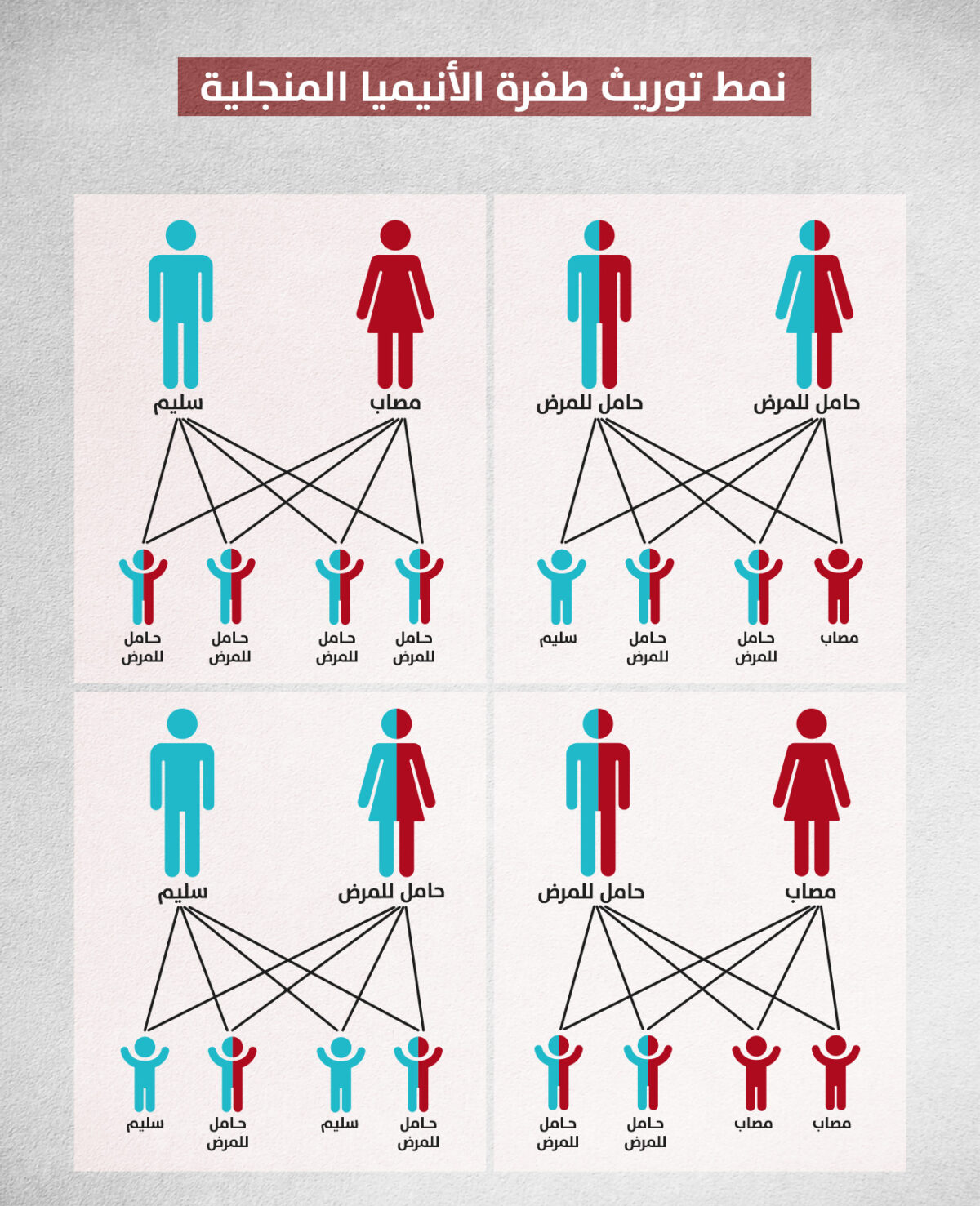 في حالة أسامة كان كلا والديه حاملًا للمرض، دون أن يعلم، وبهذا النمط الوراثي فإن 25% من أبنائهما سيكونون مصابين بالأنيميا المنجلية. تزداد احتمالية تلاقي أبوين حاملين للمرض في حالات زواج الأقارب، بسبب استمرار توريث الطفرة المتنحية للأنيميا المنجلية عبر الأجيال المتعاقبة.