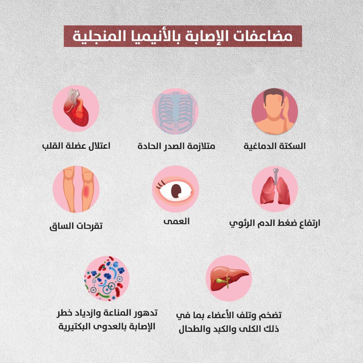 يؤدي الشكل المنجلي غير الطبيعي لخلايا الدم الحمراء إلى انحشارها داخل الأوعية الدموية، ما قد يتسبب في مضاعفات شديدة الخطورة كتلف الأعضاء والسكتات الدماغية والعمى [2].