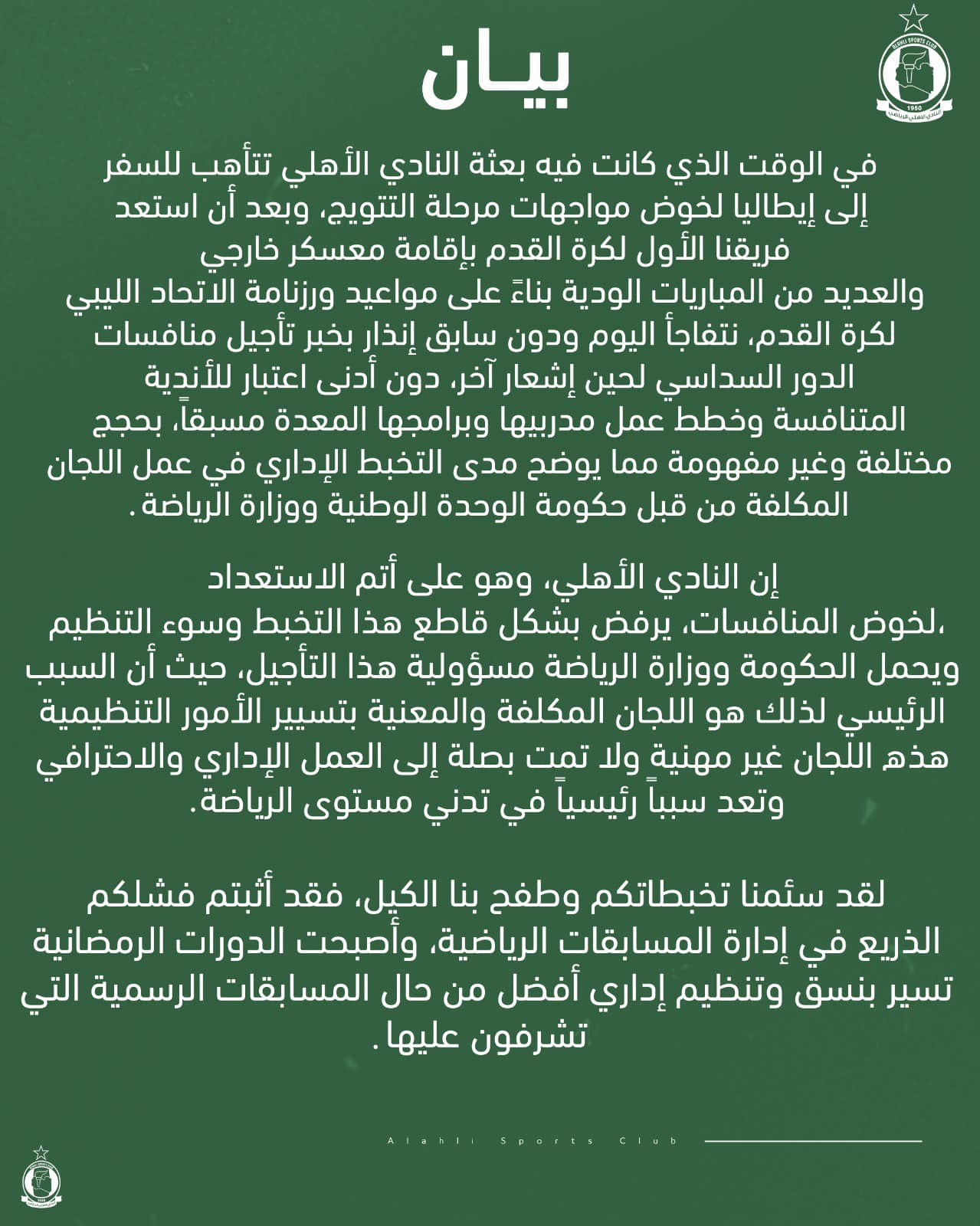 حمَّل نادي الأهلي طرابلس حكومة الوحدة الوطنية ووزارة الرياضة مسؤولية تأجيل منافسات الدور السدادسي من الدوري الليبي الممتاز لكرة القدم والتي ستقام في إيطاليا، رافضا ما وصفه بالتخبط وسوء التنظيم.