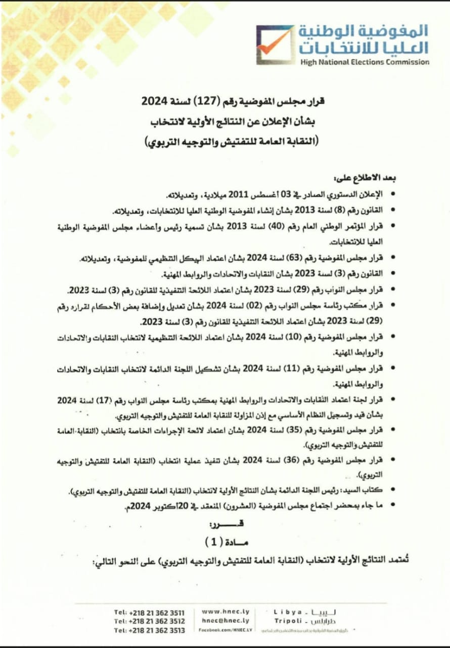 أصدرت المفوضية الوطنية العليا للانتخابات القرار رقم (127) لسنة 2024، بشأن الإعلان عن النتائج الأولية لانتخاب (النقابة العامة للتفتيش والتوجيه التربوي).