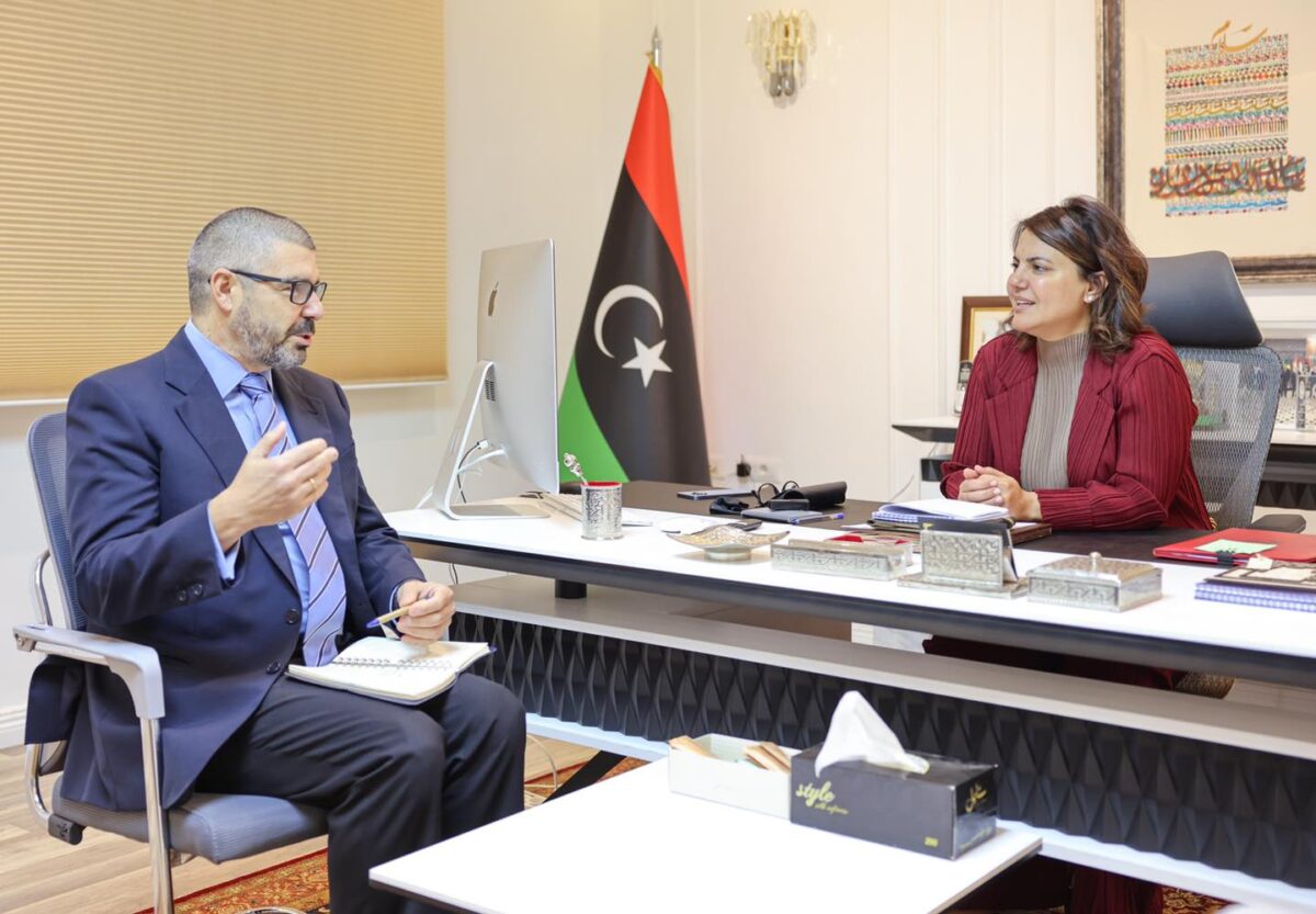 التقت وزيرة الخارجية والتعاون الدولي بحكومة الوحدة الوطنية نجلاء المنقوش، اليوم الأحد، بديوان الوزارة في طرابلس، سفير الاتحاد الأوروبي لدى ليبيا خوسيه ساباديل.
