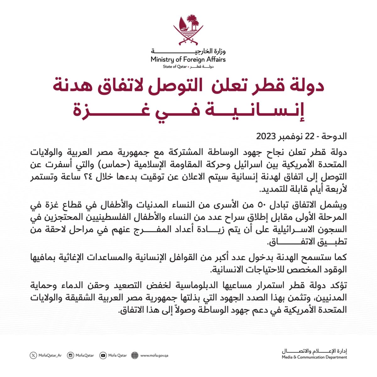 أعلنت دولة قطر نجاح جهود الوساطة المشتركة مع مصر والولايات المتحدة بين إسرائيل وحركة المقاومة الإسلامية (حماس)، إذ أسفرت عن التوصل إلى اتفاق على هدنة إنسانية في قطاع غزة تستمر لمدة 4 أيام قابلة للتمديد، وسيتم الإعلان عن توقيت بدئها خلال الـ24 ساعة المقبلة.