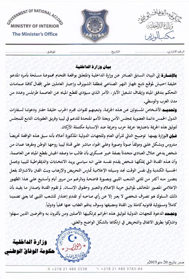 من جهتها أيضًا اتهمت وزارة الداخلية التابعة لحكومة الوفاق، خليفة حفتر بالتنسيق مع المجموعة المسلحة التي أغلقت صمامات التحكم بتدفق مياه النهر ووقف المياه عن طرابلس وبعض مدن المنطقة الغربية.