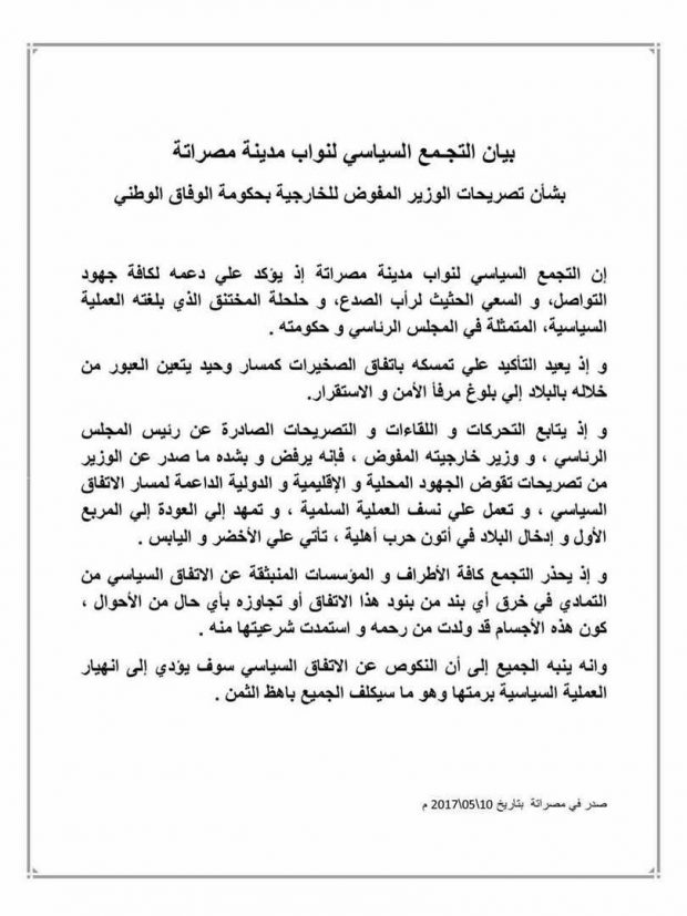 رفض التجمع السياسي لنواب مدينة مصراته تصريحات وزير خارجية حكومة الوفاق الوطني المفوض محمد سيالة، واعتبرها تقويضًا للجهود المحلية والإقليمية والدولية الداعمة لمسار الإتفاق السياسي.