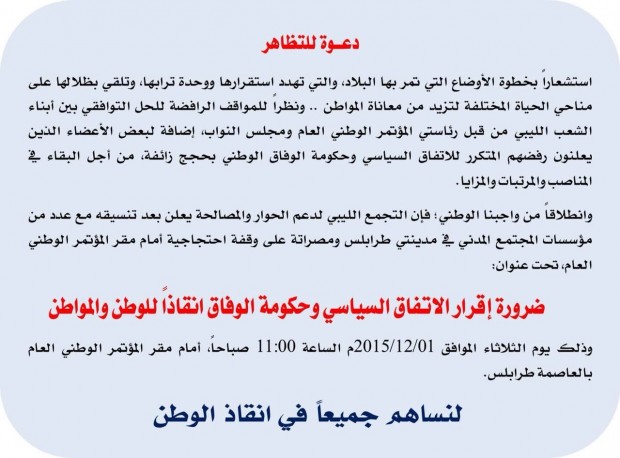 دعا التجمع الليبي لدعم الحوار والمصالحة لوقفة أمام مقر المؤتمر الوطني العام بطرابلس, غدا الثلاثاء الاول من ديسمبر دعماً لما وصفه بـ”ضرورة اقرار الاتفاق السياسي وحكومة الوفاق لانقاد الوطن والمواطن”.