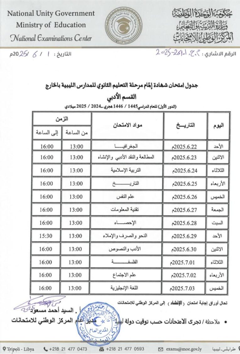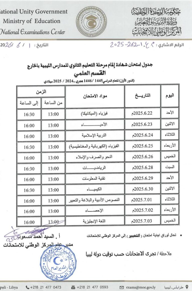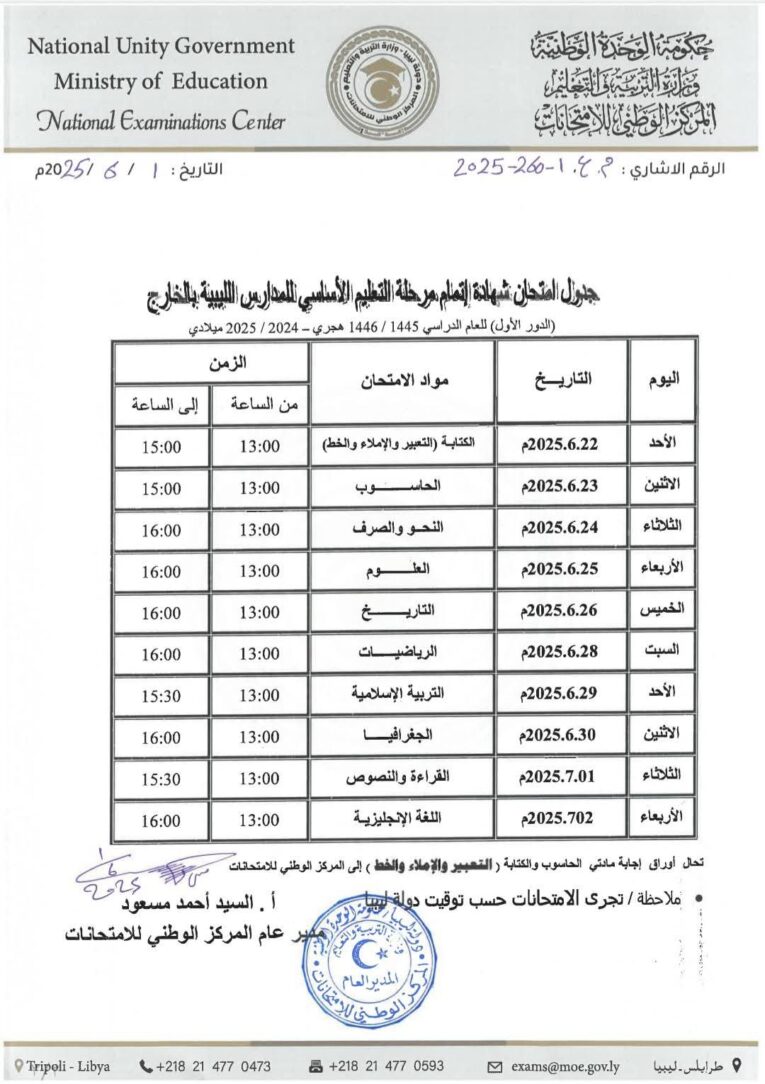 أعلن المركز الوطني للامتحانات التابع لوزارة التربية والتعليم بحكومة الوحدة الوطنية، عن جداول امتحانات شهادتي إتمام مرحلتي التعليم الأساسي والثانوي للعام الدراسي 2024–2025، الخاصة بـ المدارس الليبية في الخارج.