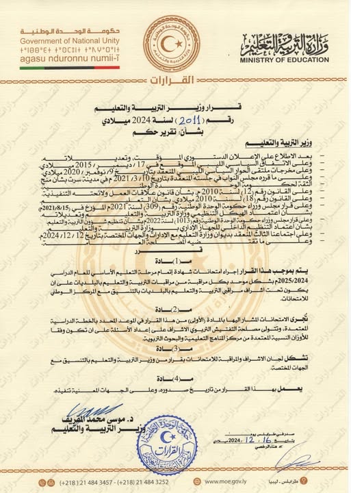 أصدر وزير التّربية والتّعليم بحكومة الوحدة الوطنية موسى المقريف، “القرار رقم 2011 لسنة 2024م بِشأن إجراء اِمتحانات شهادة إتمام مرحلة التّعليم الأساسي للعام الدّراسي 2024-2025م بشكلٍ موحّد بكل مراقبة من مراقبات التّربية والتّعليم بالبلديات”.