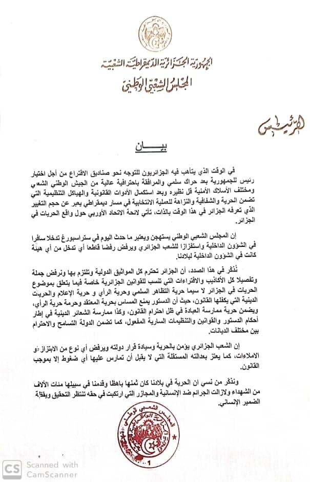 ووصف المجلس في بيان، أن ما حدث في ستراسبورغ تدخل سافر في الشؤون الداخلية واستفزاز للشعب الجزائري، بحسب البيان.
