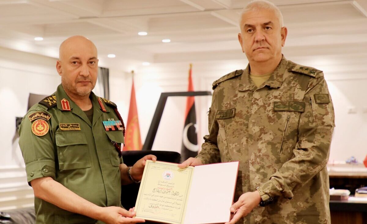 سلم رئيس الأركان العامة للجيش الليبي الفريق أول ركن “محمد الحداد” الثلاثاء، قائد بعثة التدريب التركية في ليبيا، نوط التدريب من الطبقة الأولى، وضابطي اتصال البعثة برئاسة الأركان العامة والقوات البحرية، نوط التدريب من الطبقة الثانية.