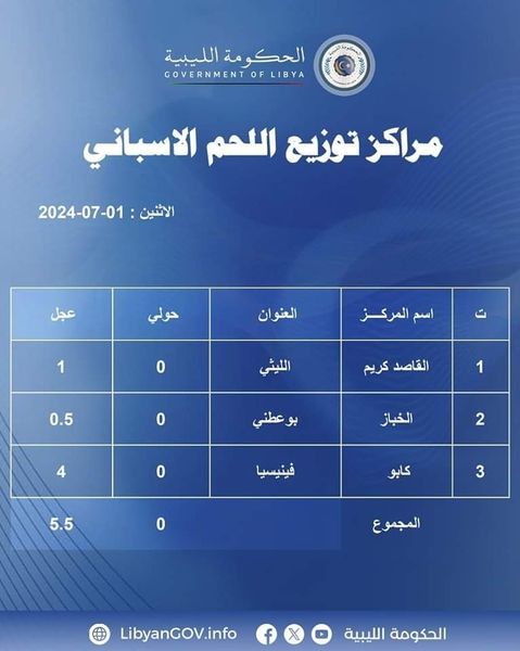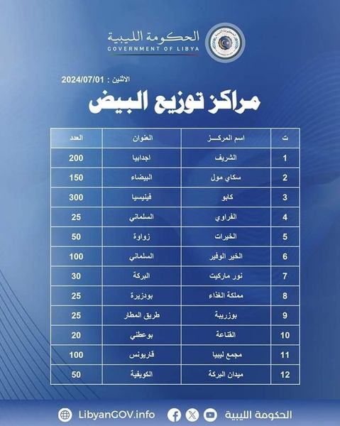 أعلنت الحكومة الليبية المُكلفة من مجلس النوّاب، عن أماكن توزيع كميات جديدة من اللحوم المستوردة والبيض في مدن بنغازي واجدابيا والبيضاء.