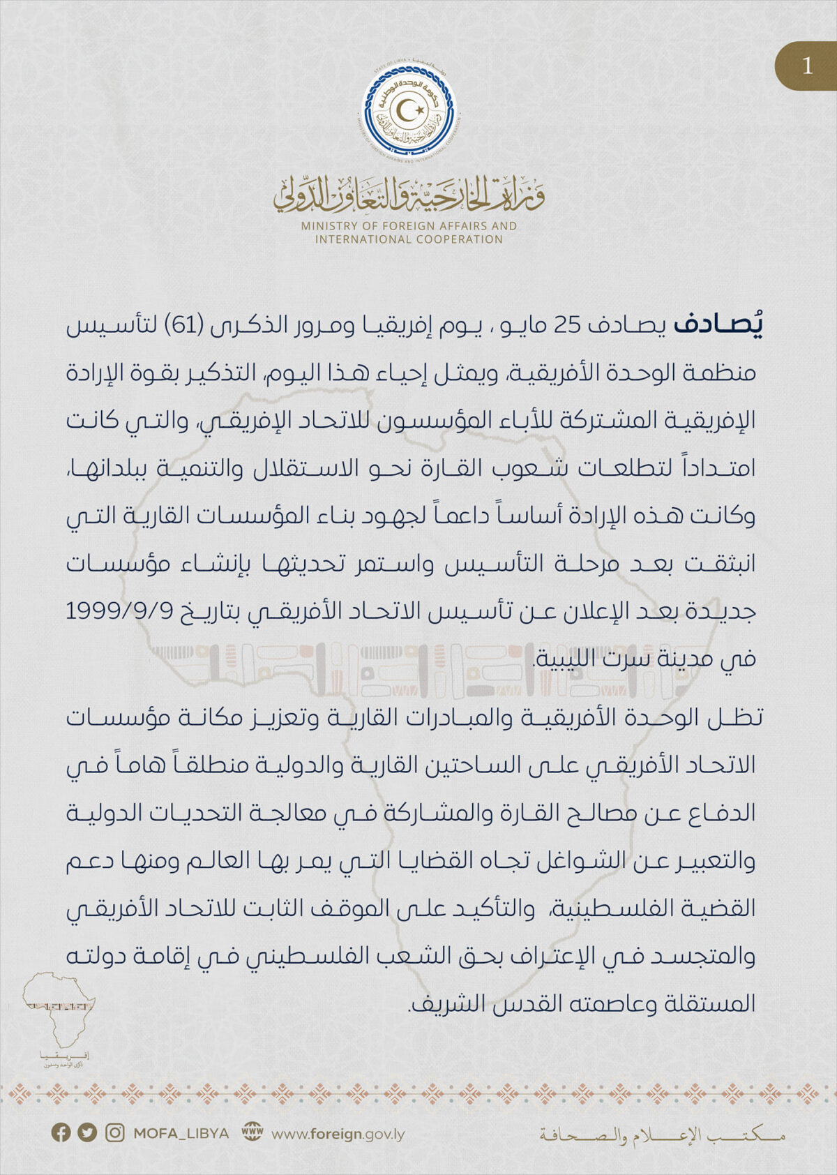 وقالت الوزارة في بمناسبة يوم إفريقيا، إنه على الدول الأفريقية التعامل مع قضايا القارة التاريخية وفق رؤيتها وخصوصيتها.
