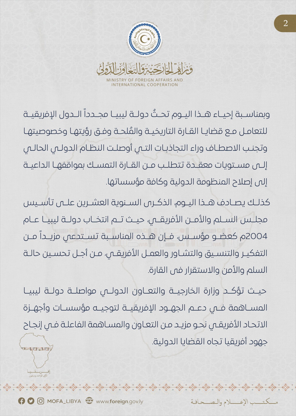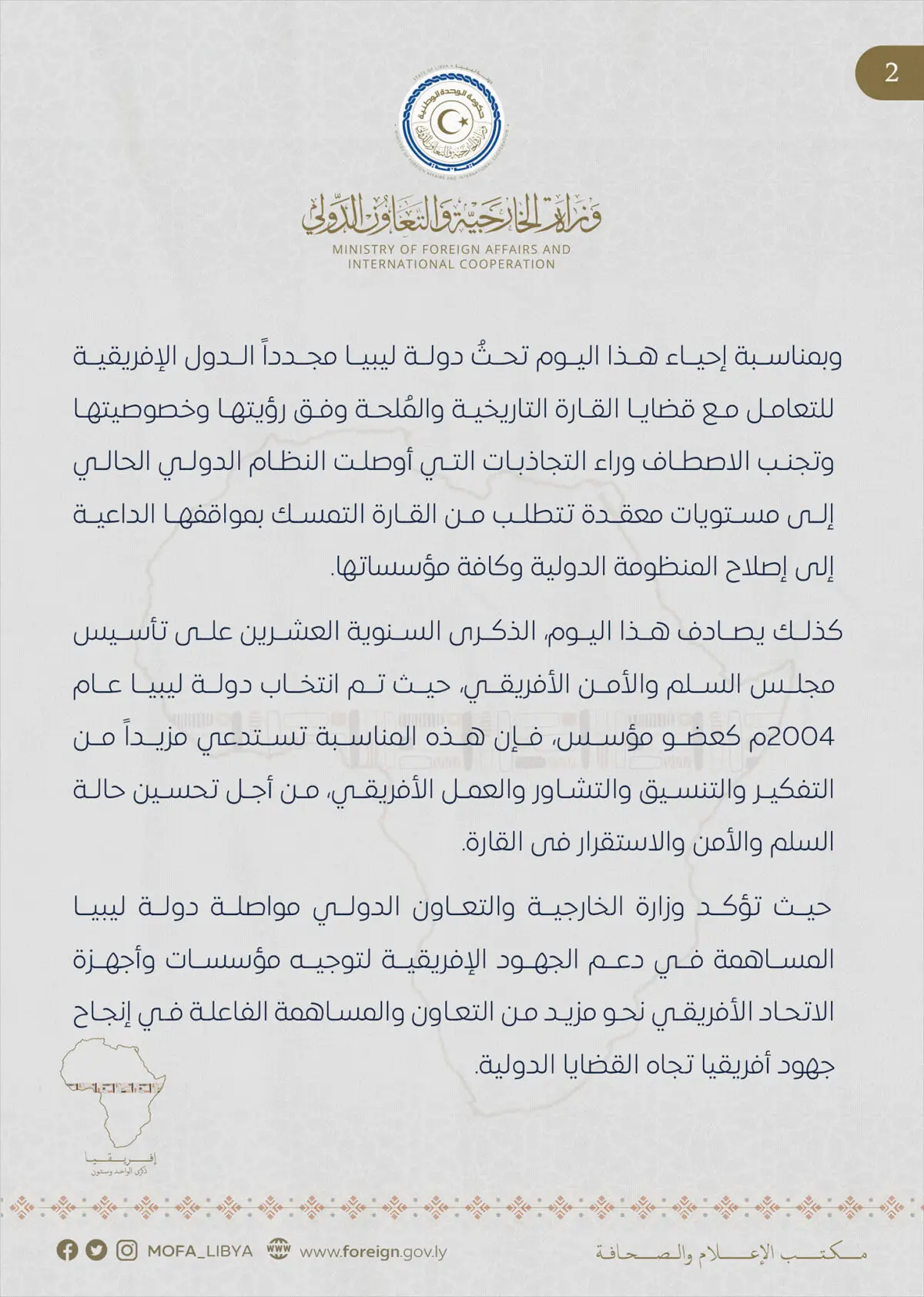 دعت وزارة الخارجية والتعاون الدولي بحكومة الوحدة الوطنية، الدول الإفريقية للعمل معا لإصلاح المنظومة الدولية ومؤسساتها، ومواصلة دعم الجهود الإفريقية لتوجيه مؤسسات وأجهزة الاتحاد الأفريقي نحو مزيد من التعاون.