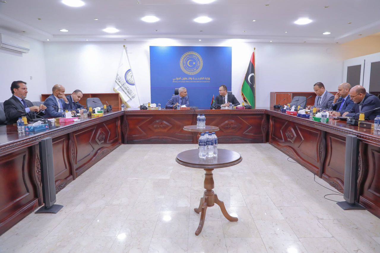 عقد اجتماع مشترك في ديوان وزارة الخارجية والتعاون الدولي المكلفة بحكومة الوحدة الوطنية، ضم كل من أشرف محمد التائب، مدير إدارة التعاون الدولي، مع مصطفى علي كشادة، مدير إدارة المؤسسات المالية والتعاون الفني بوزارة المالية، ومدير ونائب مدير إدارة التمويل الدولي بالمصرف الليبي الخارجي، ورئيس قسم المساهمات والقروض بمصرف ليبيا المركزي، وعدد من المختصين”.