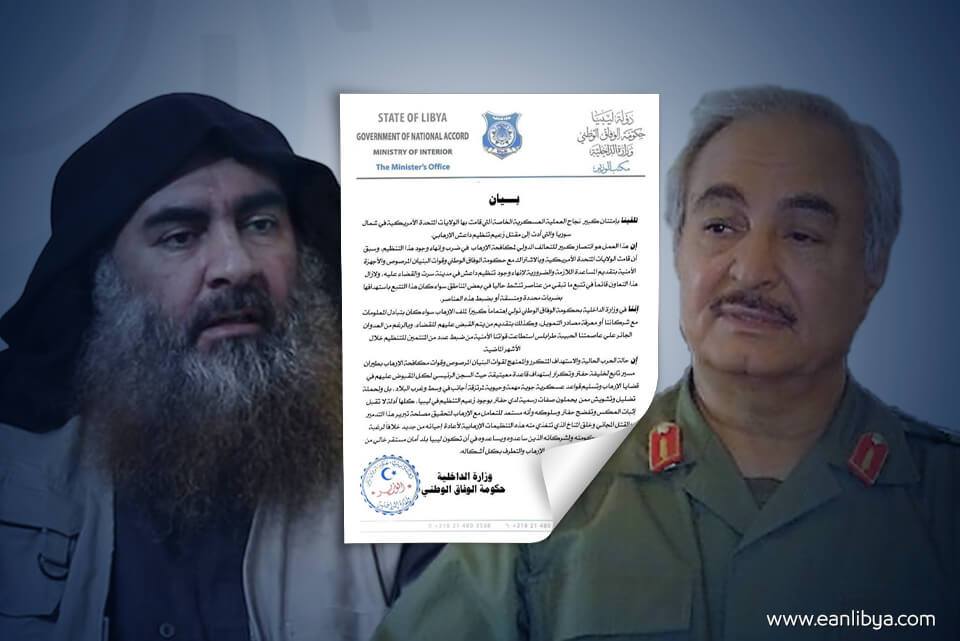 أصدرت وزارة الداخلية بحكومة الوفاق الوطني، الأحد، بيانًا حول نجاح العملية العسكرية الخاصة التي قامت بها الولايات المتحدة الأمريكية في شمال سوريا، والتي أدت إلى مقتل زعيم تنظيم داعش أبوبكر البغدادي.