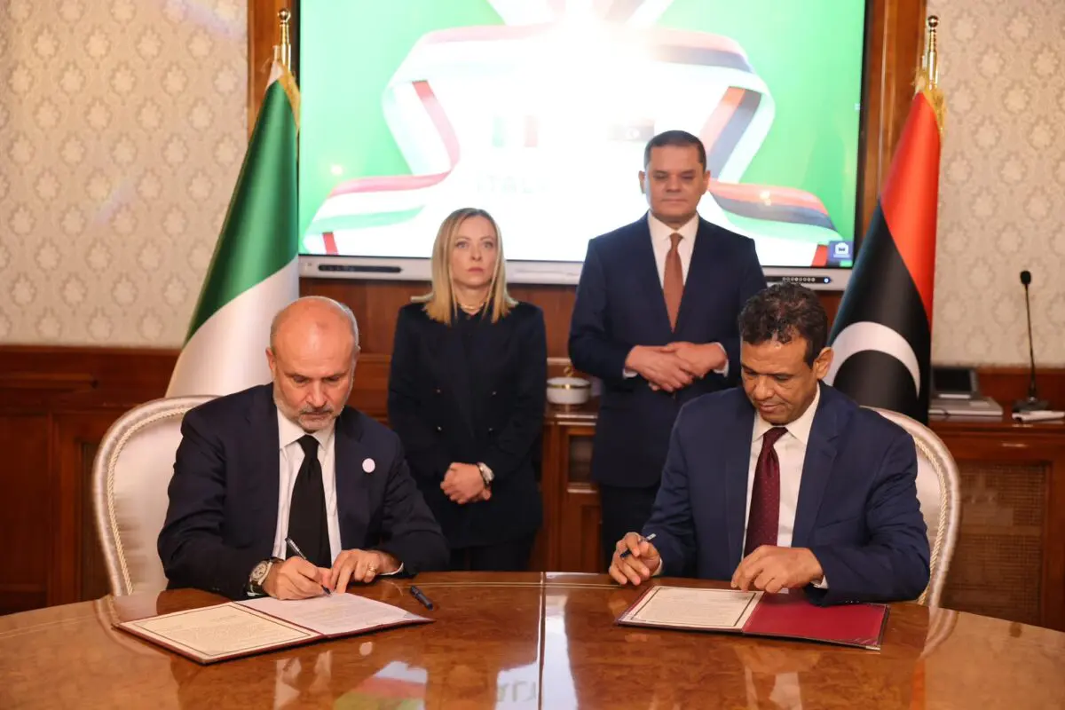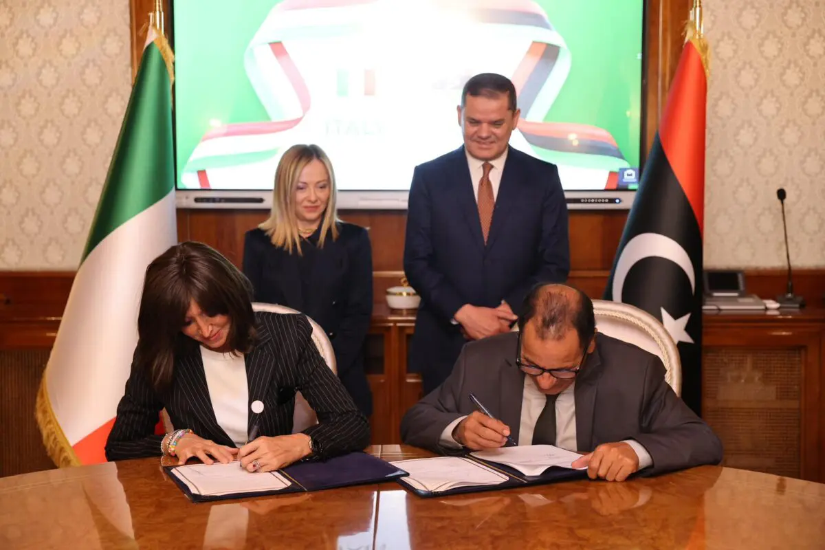 وعقب جلسة مباحثات وقع الجانبان، ثلاث مذكرات تفاهم للتعاون في مجالات التعليم العالي والبحث العلمي والصحة والرياضة والشباب، خلال زيارة رسمية تقوم بها رئيسة الوزراء الإيطالية جورجيا ميلوني إلى ليبيا.