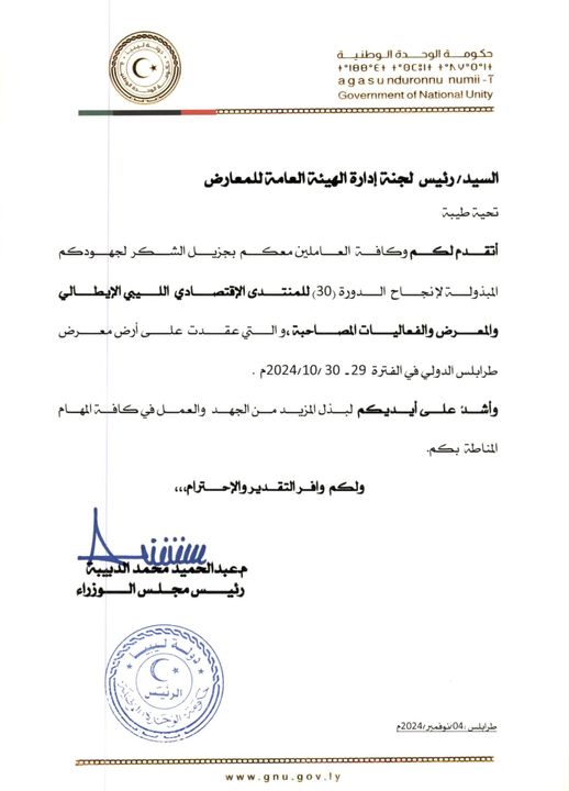 وجاء في نص كلمة الشكر، “رئيس لجنة إدارة الهيئة العامة للمعارض تحية طيبة.. أتقدم لكم وكافة العاملين معكم بجزيل الشكر لجهودكم المبذولة لإنجاح الدورة (30) للمنتدى الاقتصادي الليبي الإيطالي والمعرض والفعاليات المصاحبة ، والتي عقدت على أرض معرض طرابلس الدولي في الفترة 29 – 2024/10/30م” .