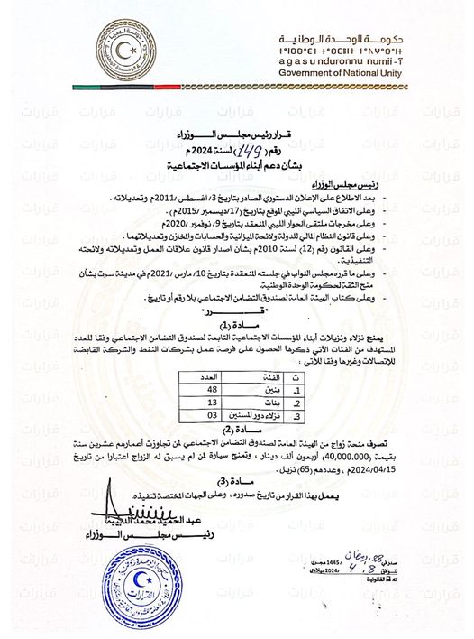أصدر رئيس حكومة الوحدة الوطنية عبد الحميد الدبيبة، القرار رقم ( 149) لسنة 2024، بشأن دعم أبناء المؤسسات الاجتماعية التابعة لصندوق التضامن الاجتماعي.