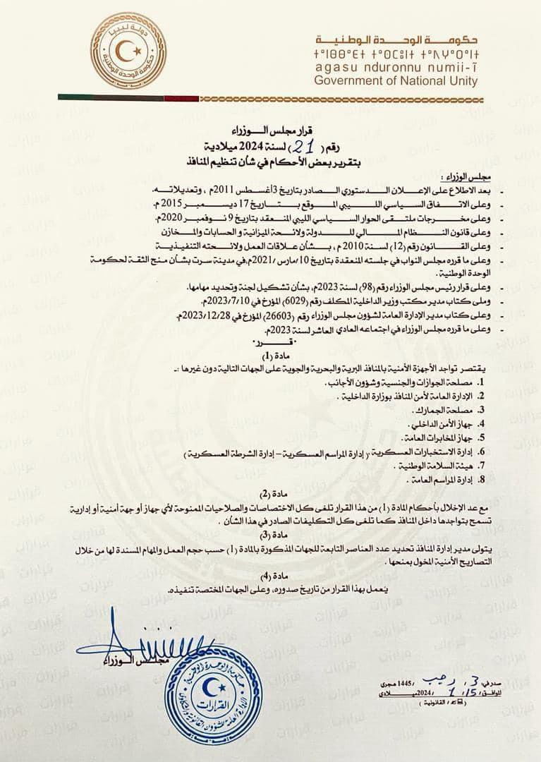 وفي سياقٍ ذي صلة، أصدر رئيس حكومة الوحدة الوطنية عبد الحميد الدبيبة، القرار رقم 21 لسنة 2024 بشأن تنظيم المنافذ.