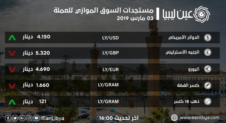 هذا وسجل سعر اليورو الأوروبي مقابل الدينار الليبي انخفاضاً طفيفاً مع بدء تعاملات السوق الموازي وبلغ سعره اليوم «4,690» دينار ليبي مقارنة بـ «4.730» عند الإغلاق بالأمس، حيث تعرضت العملة الأوروبية في منتصف شهر يناير من هذه السنة إلى هبوط قاسي لم تشهده منذ أكثر من عام.