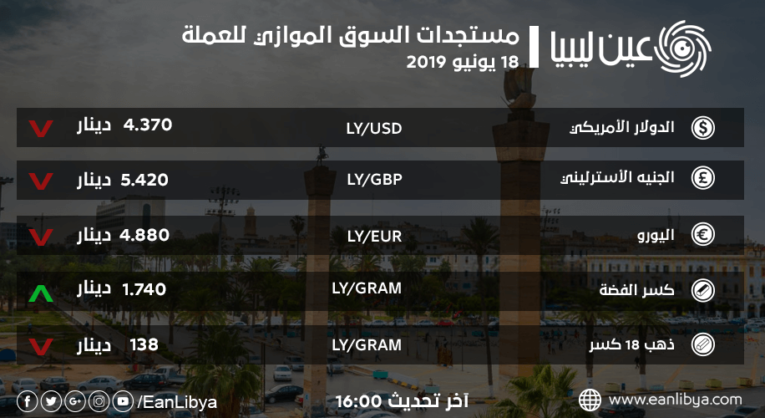 هذا وسجل سعر اليورو الأوروبي مقابل الدينار الليبي انخفاضاً طفيفاً مع بدء تعاملات السوق الموازي وبلغ سعره اليوم «4,880» دينار ليبي مقارنة بـ «4.900» عند الإغلاق بالأمس، حيث تعرضت العملة الأوروبية في منتصف شهر يناير من هذه السنة إلى هبوط قاسي لم تشهده منذ أكثر من عام.
