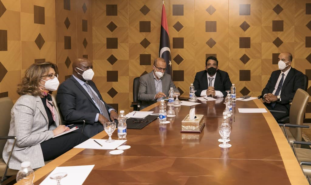 التقى رئيس المجلس الرئاسي الجديد محمد المنفي، رفقة عضوي المجلس عبدالله اللافي، وموسى الكوني، اليوم الأحد، في العاصمة طرابلس، الأمين العام المساعد المنسق الخاص لبعثة الأمم المتحدة للدعم في ليبيا ريزدون زينينغا.