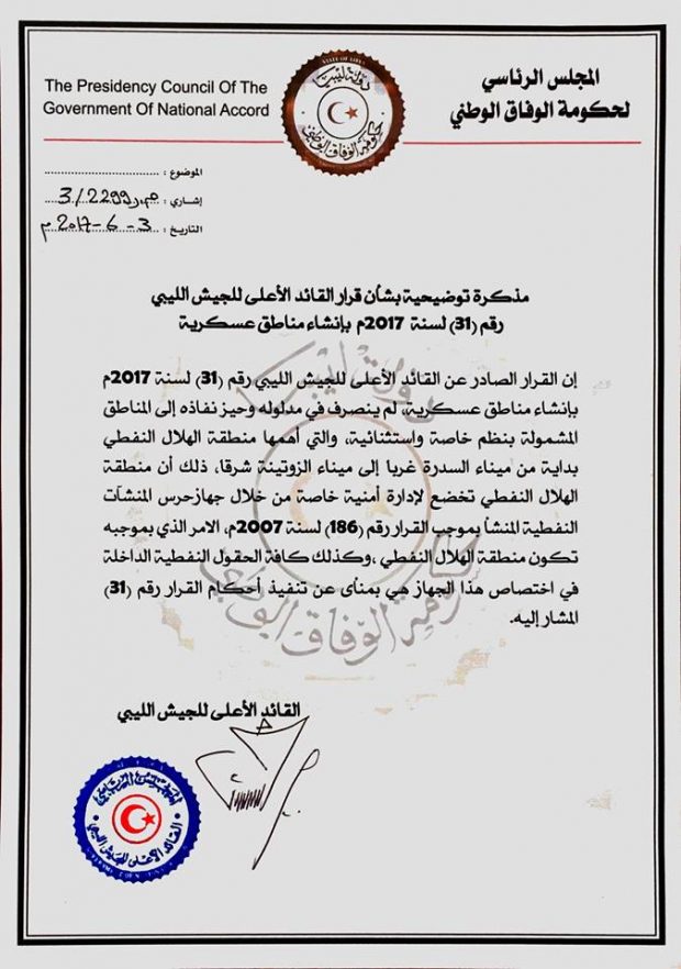 بصفته “القائد الأعلى للجيش الليبي”، أصدر المجلس الرئاسي لحكومة الوفاق الوطني مذكرة توضيحية بشأن قرار إنشاء مناطق عسكرية.