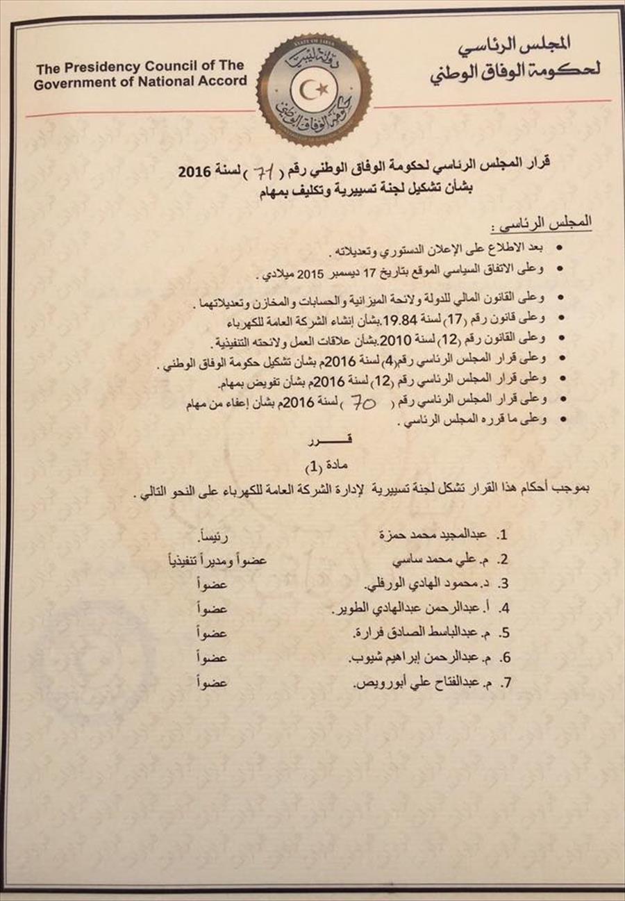 كلف المجلس الرئاسي لحكومة الوفاق الوطني لجنة بمهام إدارة وتسيير الشركة العامة للكهرباء «مؤقتًا»، تتمتع بكل اختصاصات وصلاحيات مجلس الإدارة والمدير التنفيذي اللذين أقالهما في قرار سابق.