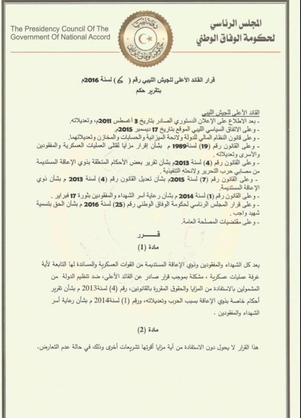 أعلن المجلس الرئاسي لحكومة الوفاق الوطني، في قرار له اليوم الثلاثاء، تحديد “الشهداء والمفقودين وذوي الإعاقة المستديمة” المستفيدين من المزايا والحقوق المقررة بالقوانين الخاصة برعاية ضحايا الحرب من أسر الشهداء والمفقودي وذوي الإعاقة. بصفته القائد الأعلى للجيش الليبي.