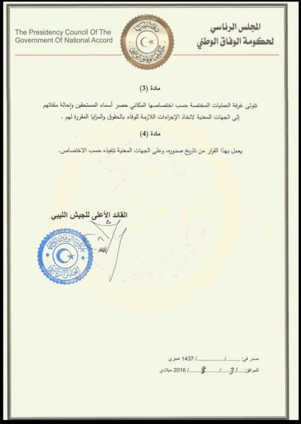 وأوضح القرار المنشور على صفحة المكتب الإعلامي لرئيس المجلس الرئاسي بـ”فيسبوك”، أنه “يعد كل الشهداء والمفقودين وذوي الإعاقة المستديمة من القوات العسكرية والمساندة لها التابعة لأية غرفة عمليات عسكرية، مشكلة بموجب قرار صادر عن القائد الأعلى للجيش الليبي، ضد تنظيم الدولة من المشمولين بالاستفادة من المزايا والحقوق المقررة بالقانونين، رقم (4) لسنة 2013 م بشأن تقرير أحكام خاصة بذوي الإعاقة بسبب الحرب وتعديلاته، ورقم (1) لسنة 2014 م بشأن رعاية أسر الشهداء والمفقودين”.