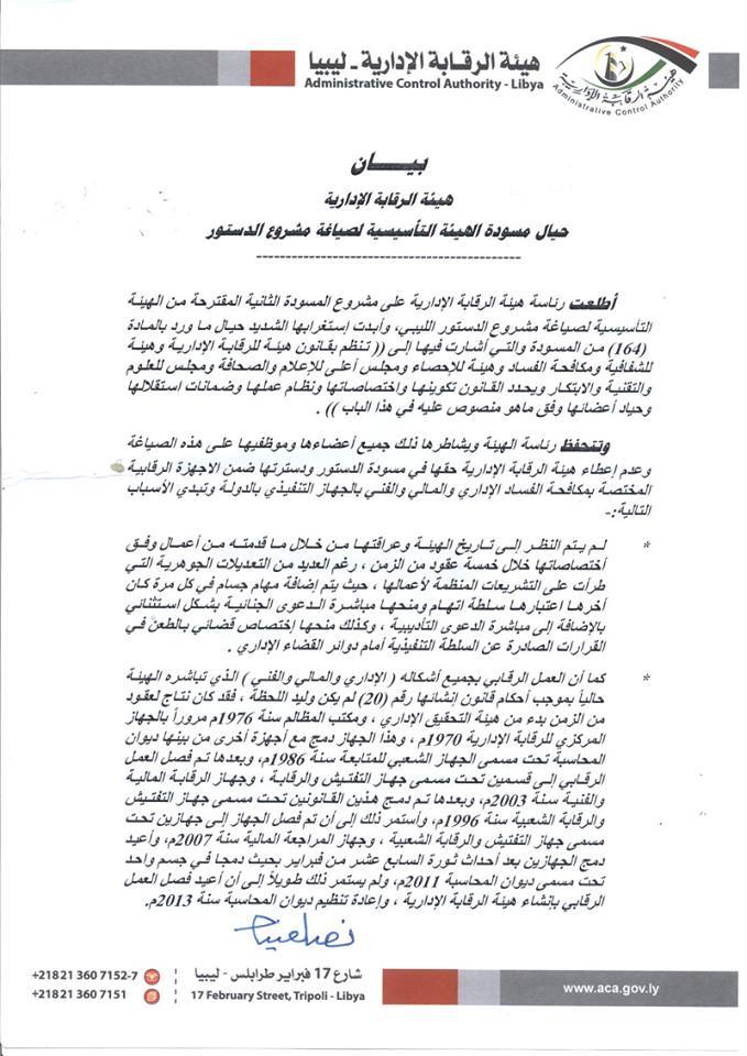 البيان أشار الى ان استبعاد هيئة الرقابة الادارية باعتبارها كأعلى جهاز رقابي وادراجها ضمن هيئات تنفيذية في الدولة يؤكد عدم دراية اعضاء الهيئة التأسيسية بالدور الحقيقي للعمل الرقابي وتاريخه الطويل وحمّل البيان أعضاء الهيئة التأسيسية لصياغة مشروع الدستور المسؤولية القانونية والتاريخية في عدم دسترة الهيئة وادراجها كأعلى جهة رقابية معنية بمكافحة الفساد المالي والاداري .