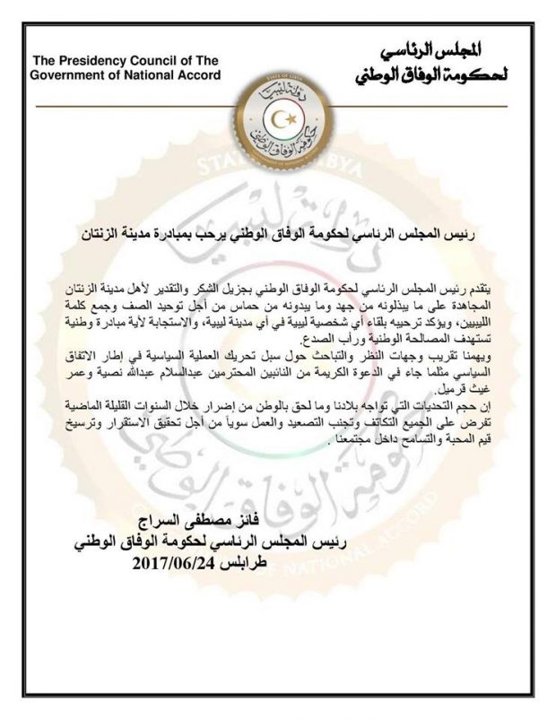 رحّب المجلس الرئاسي لحكومة الوفاق الوطني بالمبادرة التي تقدمت بها مدينة الزنتان متمثلة في لقاء يجمع “خليفة حفتر وعقيلة صالح وفائز السراج بالمدينة مبديا استعداد المجلس لتلبية هذه الدعوة والترحيب بها حرصا منه على لم الشمل وتوحيد الصف وجمع كلمة الليبيين.
